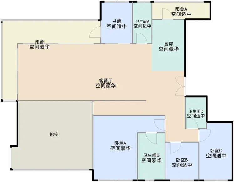 各个空间户型方正,后期空间利用率高;整个空间全明通透,采光良好,同时利于居住...
