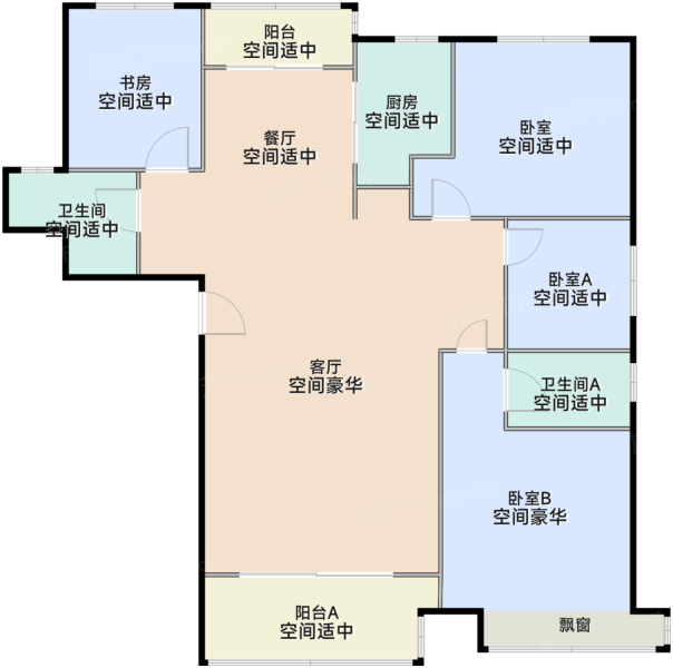 各个空间户型方正,后期空间利用率高;全明通透户型,居住舒适度较高,整个空间采...